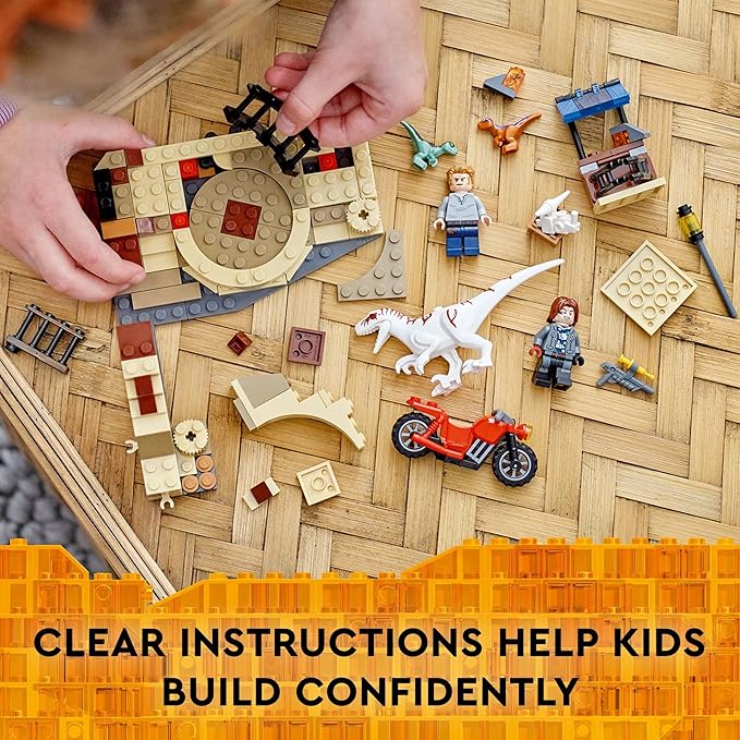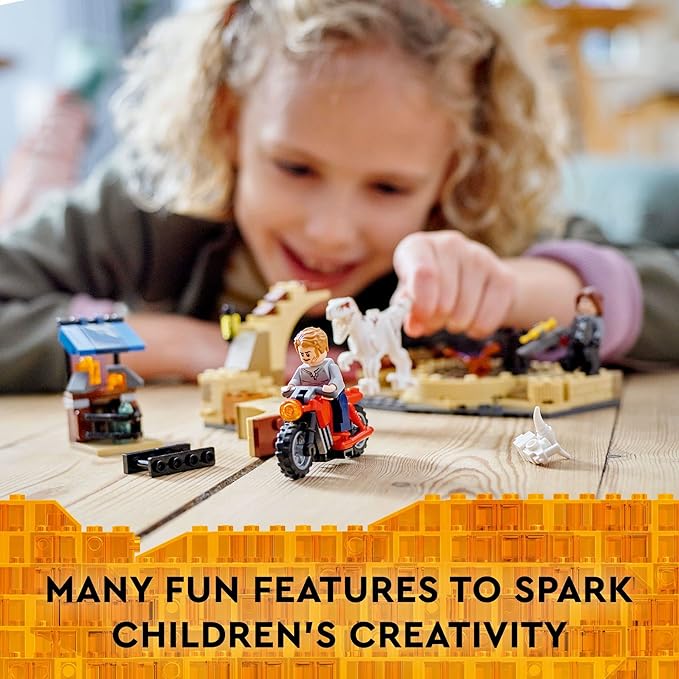 - Includes a posable Atrociraptor figure, a toy motorcycle, 2 small dinosaur toy figures, and a brick-built market