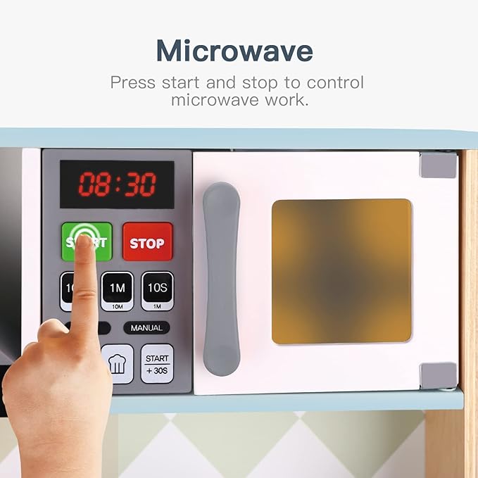 - More Playable Features: The stove,range hood and Microwave have a sim-life sound and lights with button control and automatically turn off. Additional wood food, vegetables, fruits, very real and textured,Kids would get endless fun with Removable Sink, Microwave, Stove, Oven