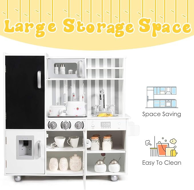 - đ˛ăComplete Playset with Accessoriesă: This kids kitchen playset has spacious open shelves and closed cabinets large enough to store kitchen essentials. On the left side of the play kitchen, there is a towel rack for hanging cloths. Equipped with a stove, sink, water dispenser, refrigerator with blackboard, ice maker and 7 other accessory utensils including 2 spice bottles, pots, pans, spoons, forks and spatulas, this wooden play kitchen provides an authentic kitchen experience.