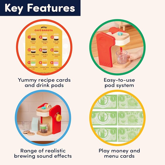 - Barista Playset: A toy coffee machine with realistic sound effects and accessories for tons of imaginative pretend play.