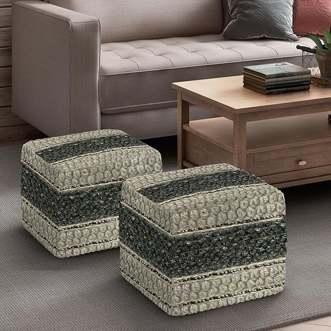 SIMPLIHOME Grady Square Pouf, Footstool, Upholstered in Green, Natural Handloom Woven Wool and Cotton, for the Living Room, Bedroom and Kids Room, Boho, Contemporary, Modern