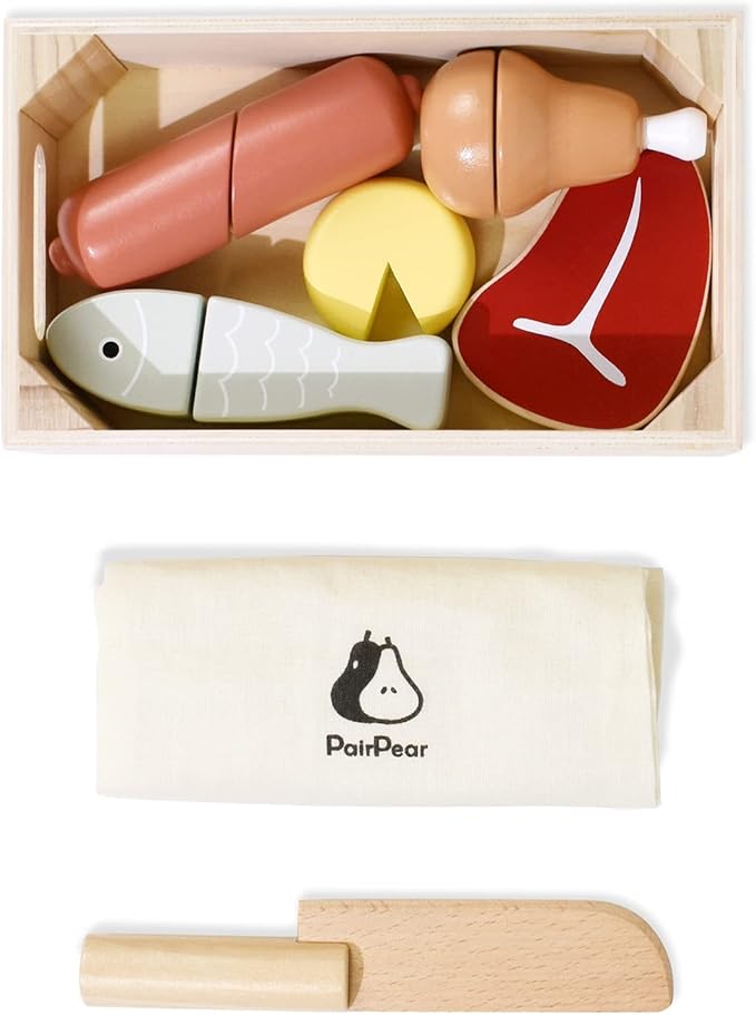 PairPear Wooden Play Food Cutting Meat Set - Wooden Toys for Toddlers Toy Food Play Kitchen Accessories