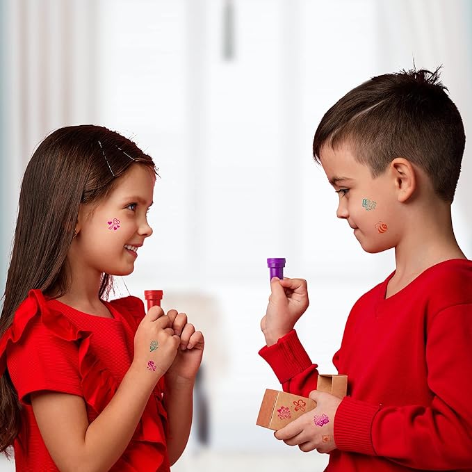 - UNIQUE DESIGN. Self-inking stamps for children are made from 100% safe color pigments and non-toxic materials that meet the US toy standards. There is no need to fill ink as each plastic stamp comes pre-inked. The safety test was successful. This self-inking stamp set creates joy and excitement for kids.