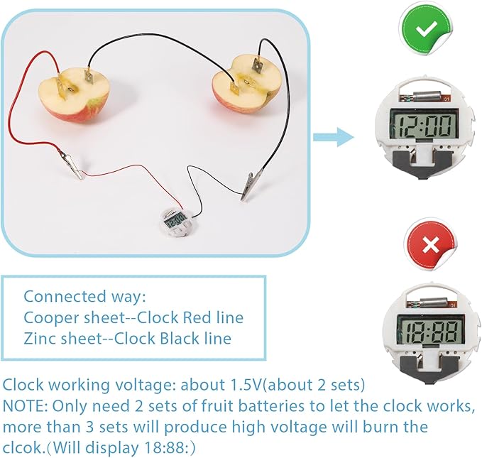 - Easy to Operate: It is easy to use in scientific projects. Before experiment , you only need to prepare lemons, apples or some vegetables and beverages to assemble the battery. We provide simple experimental ideas. Please kindly see the circuit combination on our pictures and avoid short circuit