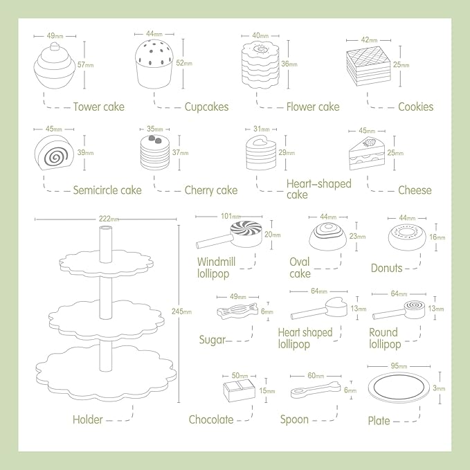 - 2.❤WHAT YOU GET: 22pcs parts,consists of 1pc 3-layers dessert stand holder, 1pc tower cake, 1pc cupcake, 1pc flower cake, 1pc cookies, 1pc semicircle cake, 1pc cherry cake, 1 heart-shaped cake, 1 cheese,1 windmill lollipop,1pc oval cake, 1pc donuts, 2pcs sugar, 1pc heart shaped loliipop, 1pc round lollipop,2pcs chocalate, 2pcs spoon, 2 plates