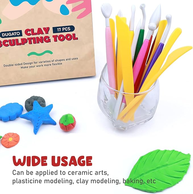DUGATO Clay Modeling Tools, 17pcs Plastic Ceramic Pottery Tool Set, Double-Head Design, Assorted Colors, for Shaping and Sculpting, Cake Decorating Supplies Kit for Beginners DIY Craft