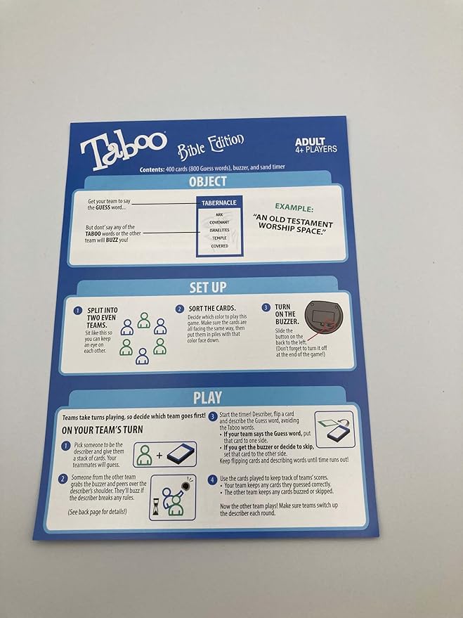 - Featuring the same uproarious fun as regular Taboo but, with faith based content.