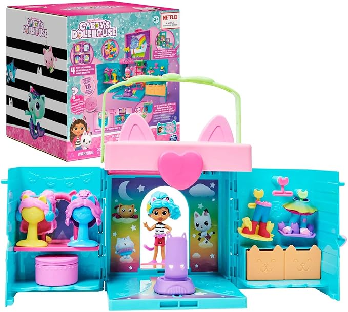 - Includes: 1 Portable Playset, 1 Gabby Girl Figure, 1 Rope Ladder, 2 Wig Stands, 1 Camera, 1 Tripod, 9 Accessories, 2 double-sided chip-art backgrounds, 1 dollhouse delivery, 1 instruction sheet