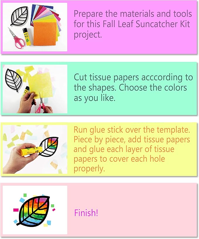 - [FEATURES] This easy and simple create your own kit contains everything needed to design and make Fall Leaf themed suncatchers. With Fall Leaf precut templates and plenty of colorful tissue paper, this suncatcher kit is guaranteed to brighten your day.