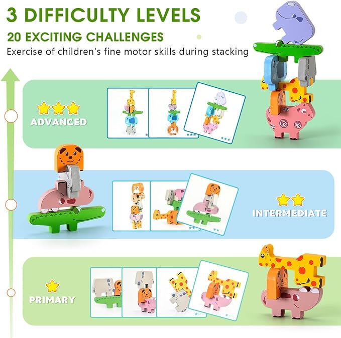 - ANIMAL BLOCKS SET (10 Pieces) -- This stacking block set includes 10 chunky blocks, 10 double-sided challenge cards with three different levels of real challenge.
