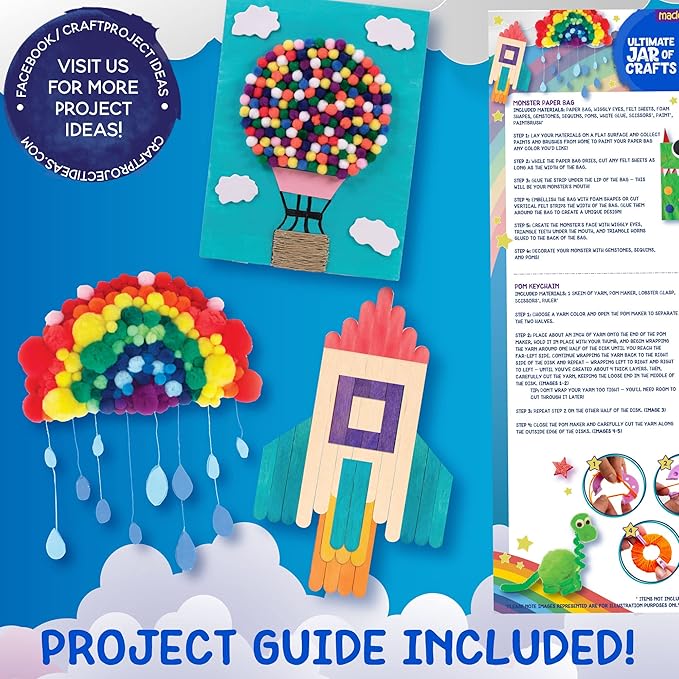 - KIT INCLUDES: 28 Fuzzy Sticks, 12 Wiggly Eyes, 1 Plastic Tapestry Needle, 20 Wood Craft Sticks, 1 Glue Tube (22 mL), 1 Lobster Clasp, 1 Paper Bag, 1 Plastic Storage Jar (6.7 in. x 11.4 in.), 3 Balls Acrylic Yarn (1 Blue, 1 White, 1 Orange, 21 m Each), 151 Pom Balls, 1 Bag Sequins (6mm-10mm), 1 Bag Pony Beads, 3 Felt Sheets (1 Green, 1 Light Blue, 1 Orange, 5” x 5” Each), 25 Assorted Foam Shapes (5 Blue, 5 Green, 2 Orange, 3 Pink, 5 Yellow, 5 Red), 1 Plastic Pom Maker, 1 Bag Adhesive Gemstones, 5 Bags Shredded Paper, Easy-To-Follow Instructions