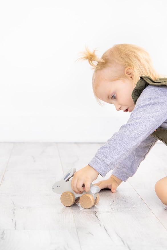 - Your little baby girl or baby boy will love playing, racing and hoping with this adorable wooden bunny push toy by Pearhead!