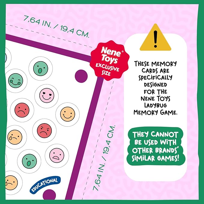 - ⚠️ EXCLUSIVELY SIZED FOR NENE TOYS: These memory cards are a unique size, specifically designed for the Nene Toys Ladybug Memory Game. Measuring 7.64 inches x 7.64 inches (19.4 cm x 19.4 cm), they cannot be used with other brands' similar games!