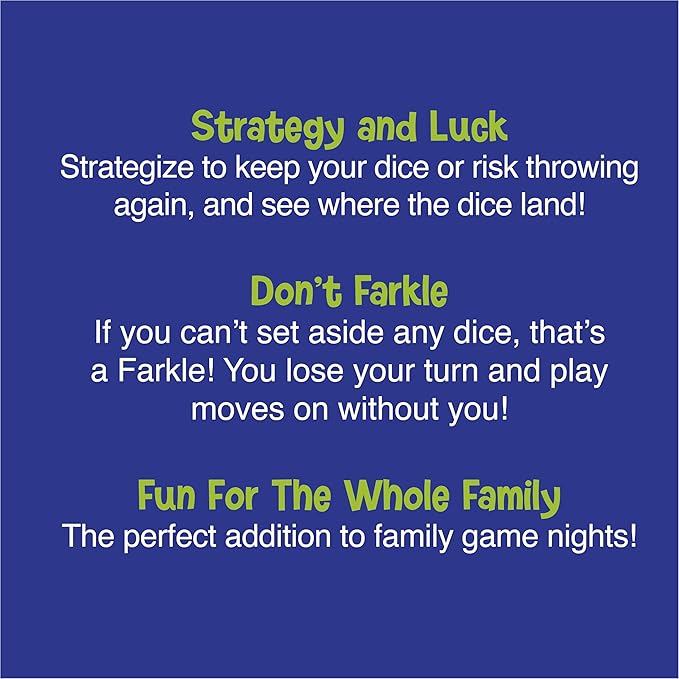 - BUT WATCH OUT: If you decide to take a risk and continue rolling, you could lose your points in a Farkle