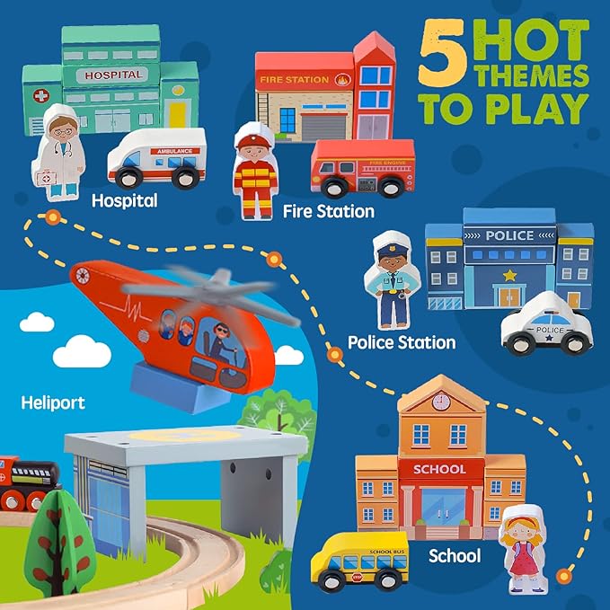 • Use Blocks To Create Your Own Town: Hot themes to play: hospital, fire station, police station, school and heliport. Rich scenario building blocks and matching character accessories are conducive to stimulate creativity and imagination! We believe that our wooden train set can promote logical thinking, problem solving, creative thinking, hand-eye coordination and fine motor skill development of your little one.