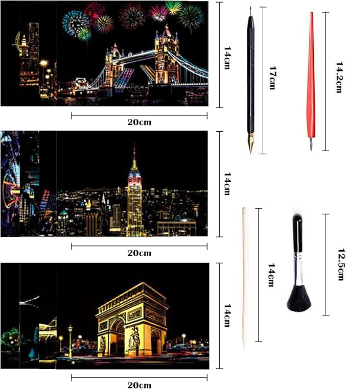 - Super Value Set: The package includes 12 sheets of scratch postcards(20*14cm), 1 scratch pen, 1 repair pen, 1 clean brush, 6 wooden styluses