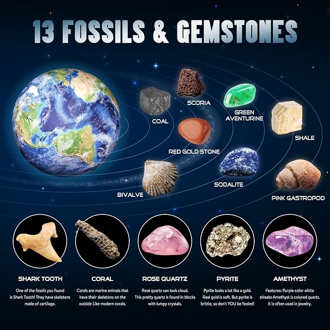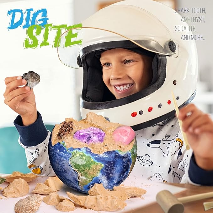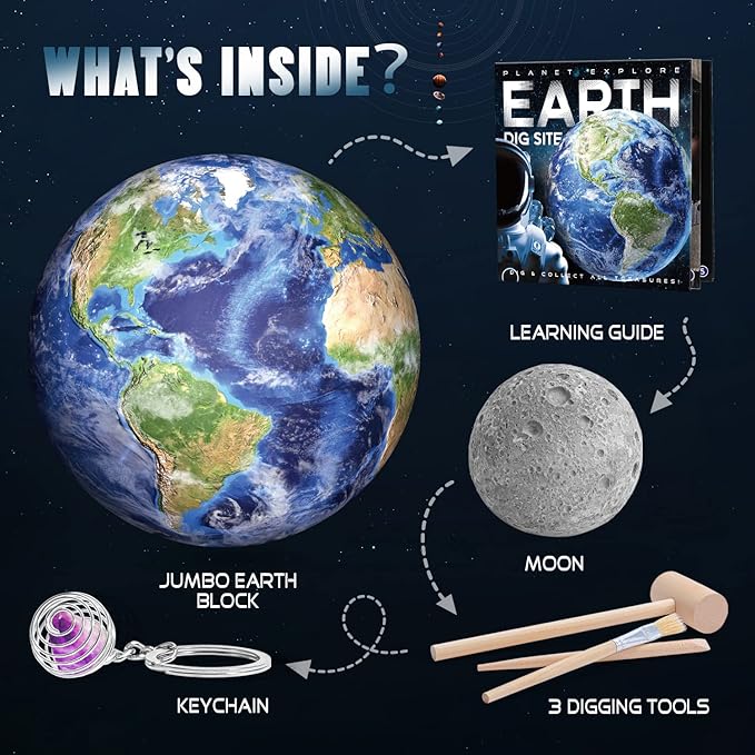 - 🌎 XXtoys Earth Dig Kit: Our solar system earth dig kits come with a big earth model and a small moon model, each with its own chisels, hammers and brushes. Using the tool makes it easier to dig out shark tooth, amethyst, sodalite and more on earth model. Get ready for an expedition on the earth like a real astronaut to uncover the cool history and mysteries of the earth