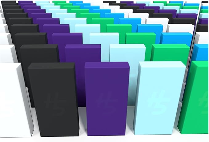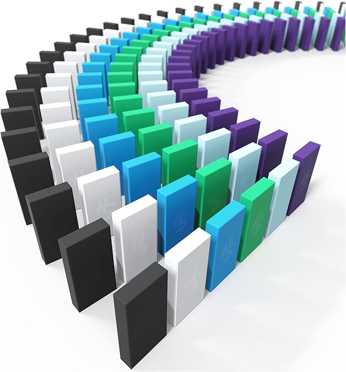 - Includes 30 black dominoes, 30 white dominoes, 30 neon blue dominoes, 30 green dominoes, 30 purple dominoes, 30 light blue dominoes