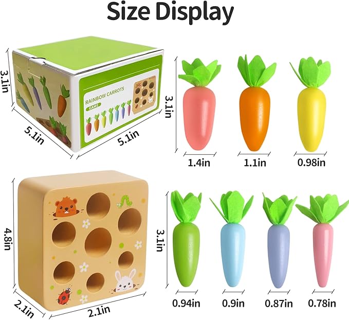 - Wooden Carrot Harvest Game: The Montessori Toys is a new kind of learning toy for toddlers. Develop your children's sorting skills through carrot sorting wooden toys. 7 different sizes of cute carrots of different sizes to match with holes for your child to explore, help your child exercise his intelligence and size exercise, and put it into the correct size slot. Help build strong fine motor skills and hand-eye collaboration.