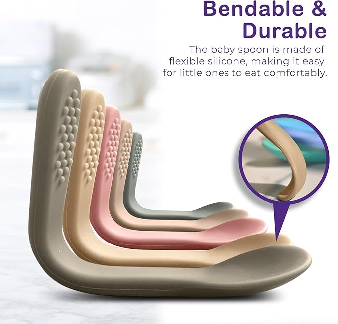 - Silicone Baby Spoons First Stage Pack of 5 - As your baby is transitioning to solids, these silicone spoons baby will aid in developing their skill of self-feeding and at the same time sharpening their motor skills, the silicone baby spoon is designed with those tiny hands in mind, so it should be easy to grasp and soft to touch. Choose these Silicone Baby Spoons self feeding 6 months to empower your baby's developmental milestones with confidence and comfort.