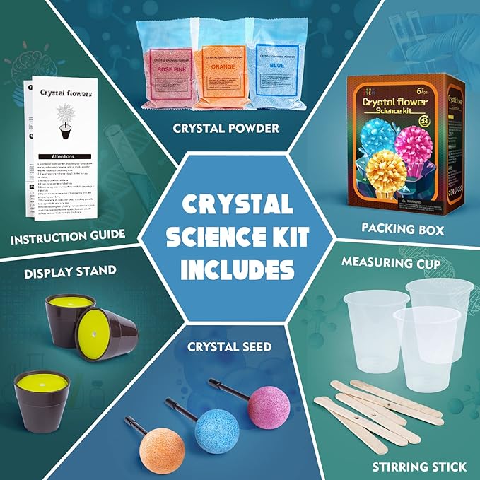 - 【Science Experiments Set】Crystal Powder *3,Measuring Cup *3,Crystal Seed *3,Display Stand *3,Stick*6,Instruction*1,Box*1.Science experiments for kids 6-8.