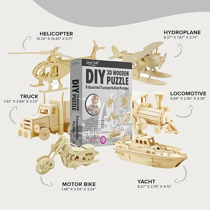 - Transportation Puzzle Set: These 6 vehicle models include a Locomotive, Helicopter, Truck, Hydroplane, Motor Bike, and Yacht. No tools or glue are required for easy assembly.