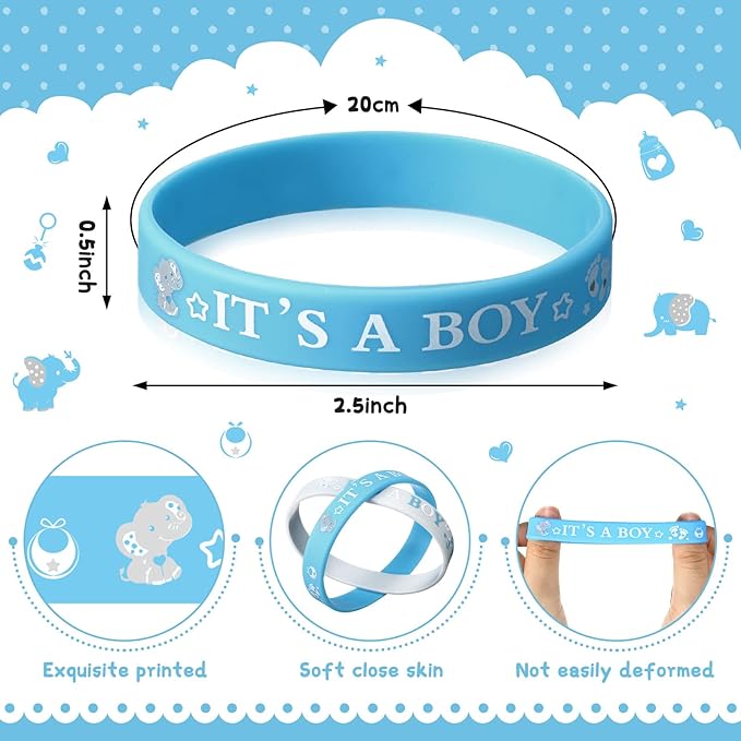 - Wide Application: it is ideal for everyone who joins the baby shower party, gender reveal party, and suitable to be applied as good gifts for your families, friends and colleagues; The baby shower rubber wristband bracelets can be matched with other baby birthday party like balloon boxes, which could create a joyful atmosphere and make your gender reveal party full of laughter