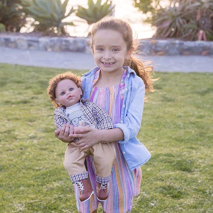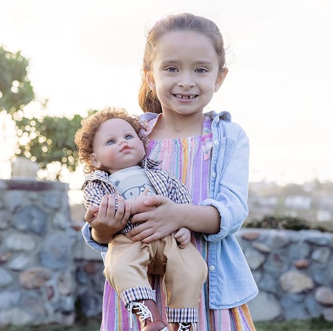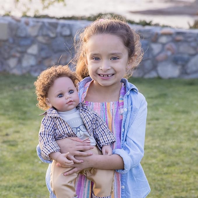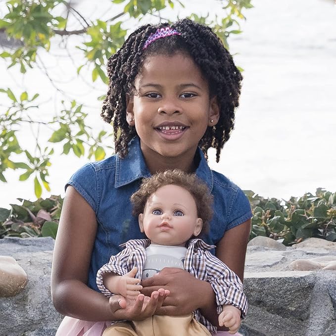 - REALISTIC DETAILS - His brown eyes are outlined by lifelike, hand-applied eyelashes, plus his mouth is slightly opened. He has a hand-painted face, curly brown doll hair, and a light skin tone, and his bean-bag weighted body gives his that cuddly, lifelike feel