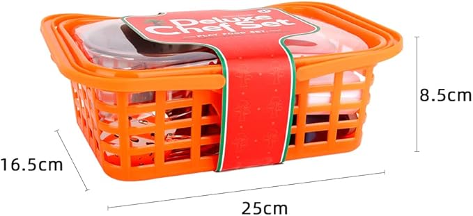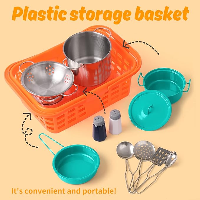 - πγ Kids Play Kitchen Accessories γβ 14PCS set includes: One colander, one stockpot, one pan and one low pot, comes with one covers, one spatula, one ladle, one draining spoon, one spaghetti server, one table mat and 2 spice bottles. There is also a carrying basket to store all the kitchen utensils.