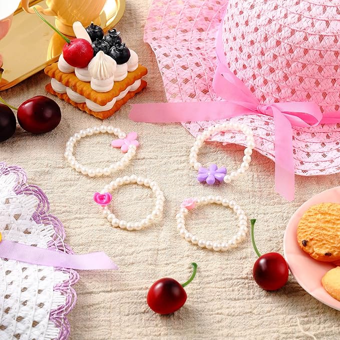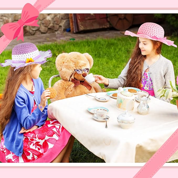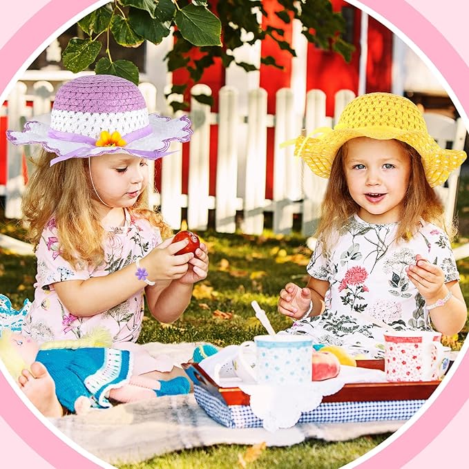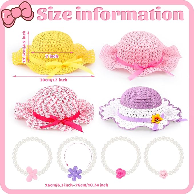 Zhanmai 4 Pcs Christmas Girl Tea Party Hats Straw Hat for Girls Sun Dress up Hats for Kids Toddlers with 4 Pcs Pearl Bracelets for Children Costume Birthday Party Supplies Christmas Beach Travel Gifts