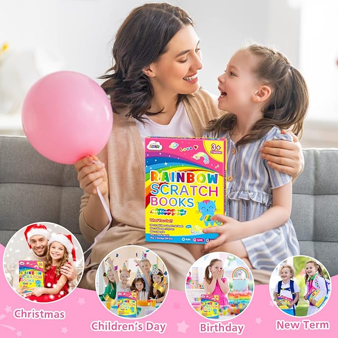- 🌈✍️🎁Learn, Fun & Portable Set: 🍒A cute pink gift box that features 3 sizes gift note pads, 1 white brush, 4 colorful stencils and 6 wooden stylus meeting ground artwork needs. The rainbow drawing scratch notepad set is a great kids toy, which can stimulate children's imagination and creativity, allowing them to learn drawing & enhance creative. It's not only a toy but also a communicative link between parents and kids