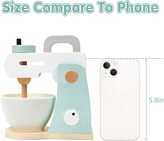 - Real Looking Design - Real Looking wooden toy mixer design is a wonderful addition to the kid's pretend play. The kids can dial turns to choose speed, we simulated the adjustment of 3 mixing speeds.