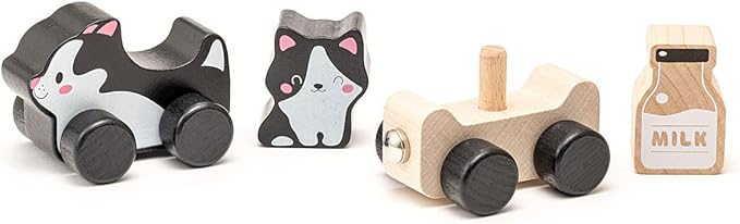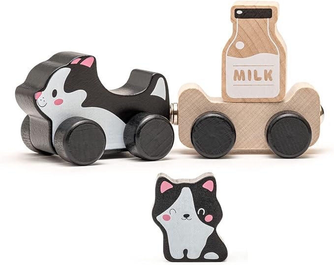 - ADORABLE CAT THEMED TRAIN TOY: This wooden train set features a mother cat, a kitten, and a milk bottle, offering a delightful and interactive play experience for toddlers who love animals
