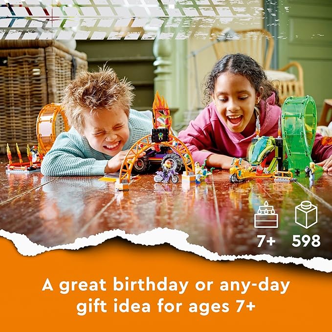 LEGO City Stuntz Double Loop Stunt Arena 60339, Monster Truck Playset with 2 Toy Motorcycles, Ramp, Wall of Flames, Ring of Fire, Snapping Snake Loop and 7 Minifigures, for Kids Ages 7 Plus