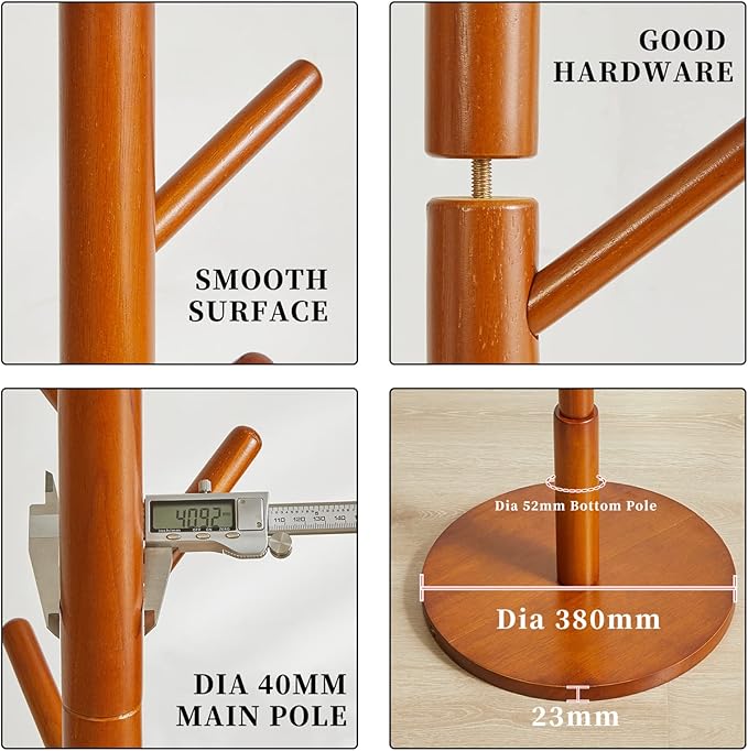 - Stable and sturdy: The coat rack is made of solid wood, and the base is a thick, wide, heavy-duty disc that provides excellent sturdiness with load-bearing 8 lb each hook and max total 40 lb