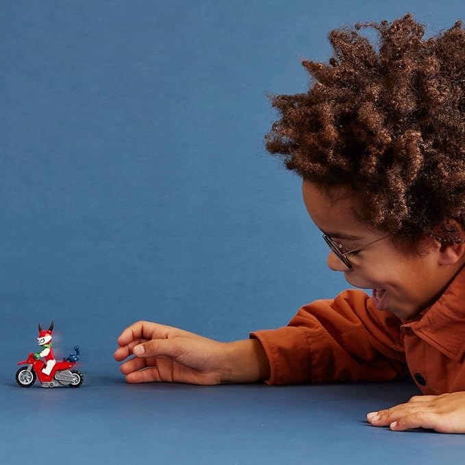 - LEGO City Stuntz toy for kids age 5+ years old features a flywheel-powered toy motorcycle and a LEGO racer minifigure