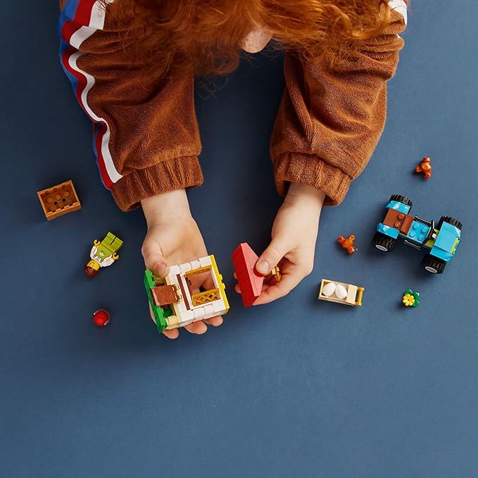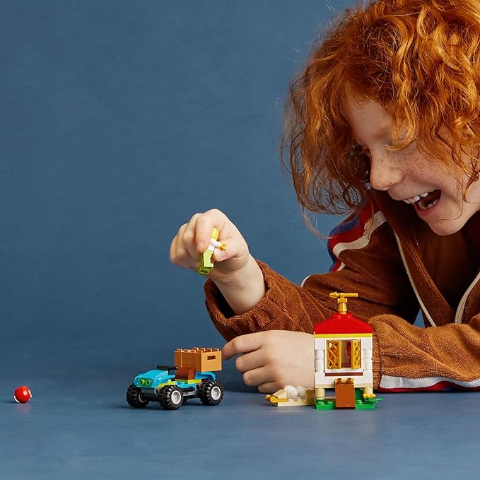 - Everything kids need to create a toy Chicken Henhouse, an ATV with tilt-to-turn functionality, plus a farmer minifigure, 2 chicken figures and accessories including 2 eggs