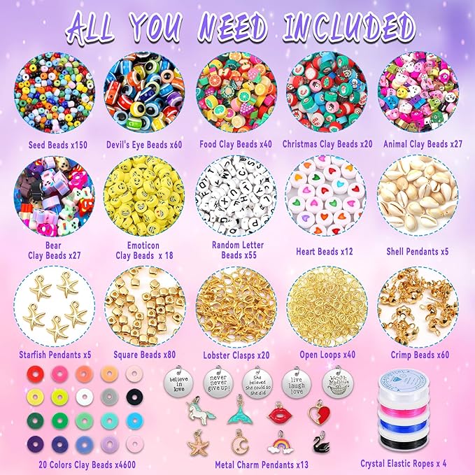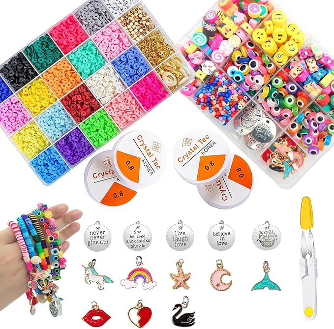 - 【BRACELET MAKING KIT FOR GIRLS】:Designed for creative and crafty girls ages 5-12, this bracelet making kit includes everything they need to create beautiful and unique bracelets. With an array of colorful clay beads and easy-to-follow instructions, girls can explore their artistic side and make their own jewelry.