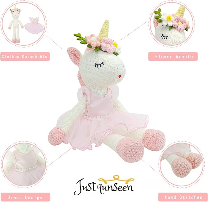 - 【Unicorn Stuffed Animal】 : JUSTQUNSEEN presents this super soft, cute, charmingly detailed unicorn stuffed animal. The Pink unicorn's name is Alice! Babies, toddlers, and kids love this classic and collectible comfy partner. It is a huggable friend for kids on road trips & airplanes. It can be also used as 4 year old girl birthday gifts for girls.