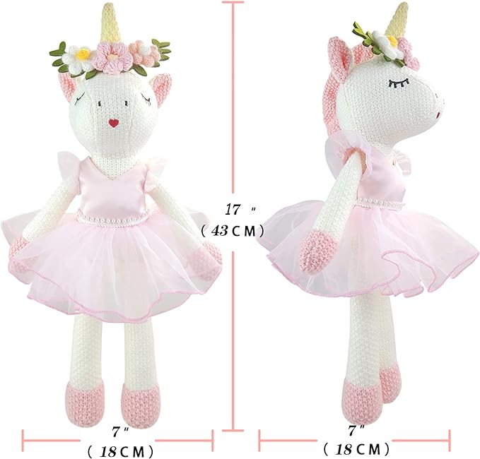 - 【Unique Design】This unicorn princess is wearing a delicate pink dress with a belt made of pearls. The skirt is made of high quality satin and organza fabric material ,which looks very elegant. There is a unique wreath design on the top of the head, the flowers on the wreath are handmade, this design makes the overall look more exquisite. It's also has a yellow unicorn horn on its head. The facial expression looks very cute and beautiful. No one can refuse to such a beautiful unicorn princess!
