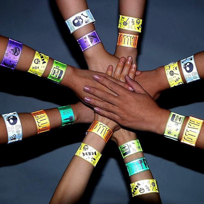 - SUPER VALUE PACK. Our Classroom Halloween Treats includes 72 PCS Reflective Slap Bracelets in 6 designs of Halloween slap bracelets which are the perfect non-candy presents for Halloween presents.
