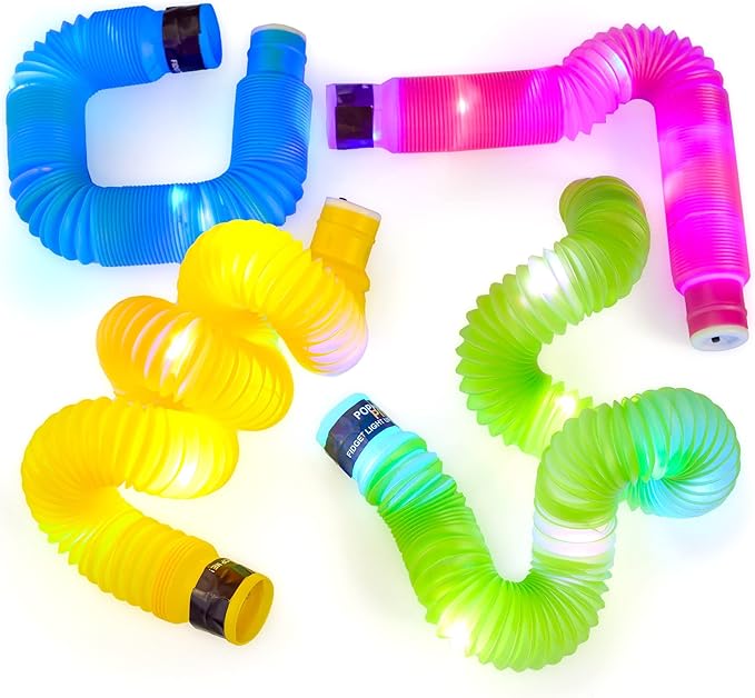 - 🌈 FUN LIGHT UP TOY FOR KIDS - bright rainbow colored LED pop tubes are super fun for playing in the evening inside or outside; teach the kids LETTERS and SHAPES with this educational STEM toy and get toddlers to improve motor skills or have them fidget in the car; STRESS RELIEF FOR ADULTS - no joke, give an adult a pop tube and transform him into a child who won't let his new toy down and keep popping; The magic LED sparklers have 2 STAGES - BLINKING LIGHTS or PERMANENT - Easy ON or OFF.
