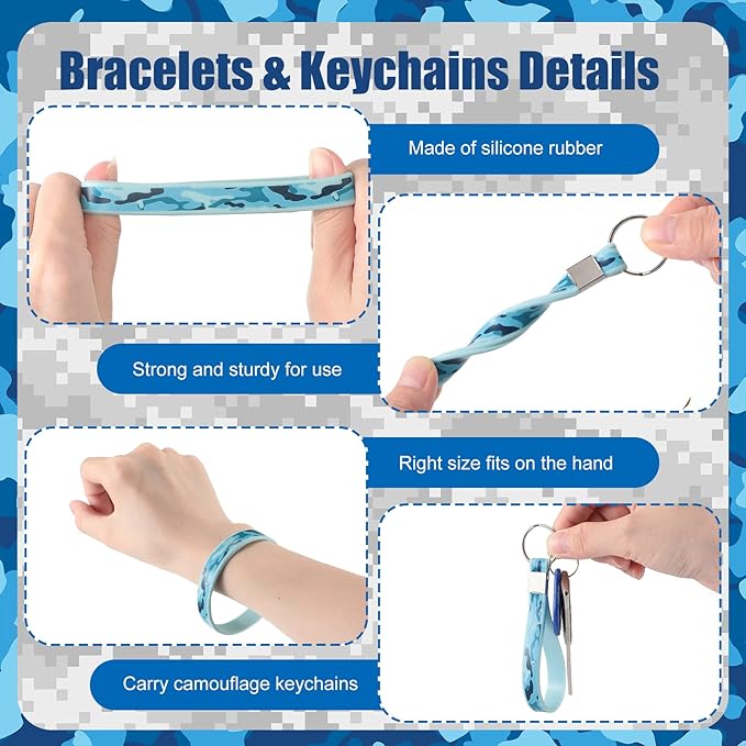 - Package Contains: you will receive 36 pieces camouflage party kits, including 12 pieces camo drawstring backpacks, 12 pieces camouflage army rubber bracelets and 12 pieces silicone camouflage keychains, multiple colors and different patterns designed to make you stand out from the crowd, sufficient quantity to meet your replacement needs, and you can also share with your family and friends