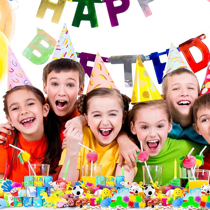 - Assorted Party Favors: sticky hands, stampers, squishy, stickers, rings, pull back cars, sports balls, puzzles, tumblers, stretchy men, dinosaur, water growing creatures, chicken finger toys, slap bracelets, spiky hedge balls, insects, blowouts