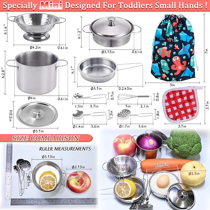 - 【Premium Quality & Child Safe】The play pots and pans set is unmatched durability, adopts fine polishing, smooth edges won't hurt your little angel's little hands.Handles is welded firmly, not easy to break,can be use on dishwasher safe and Durable . The miniature realistic stainless steel cookware toys all come in a cute beautiful marine patterned cloth bag with drawstring handle,neat and easy to carry. Give kids hours of fun to work hard like mother!