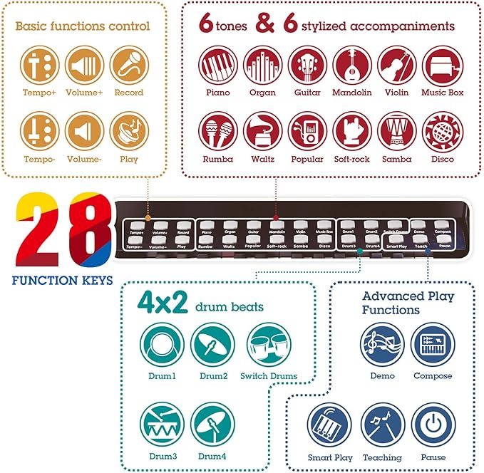 • Follow the light-up keys to learn how to play, then when you're more confident you can select your own instrument and play along to one of the six stylized accompanying tunes and eight drum beats with adjustable tempos
