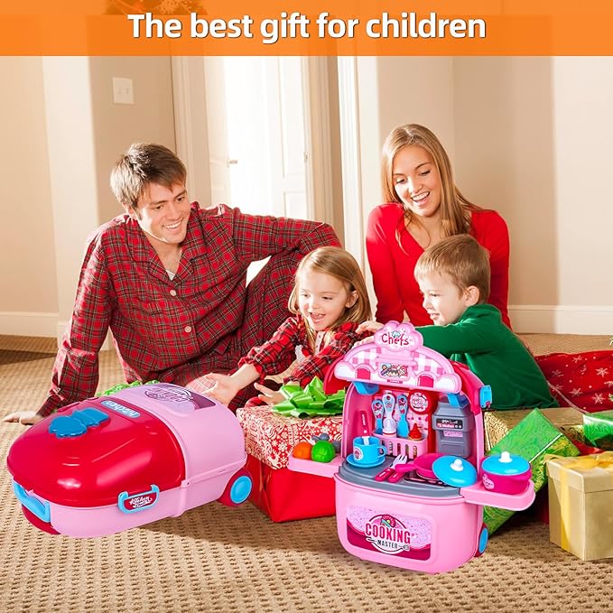 - Kitchen Toy Set Portable Design: The play set is shaped like a suitcase, making it easy to carry and store.