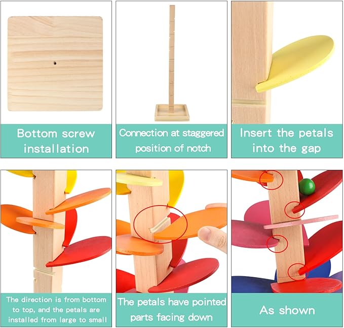 - 【Installation Steps】1. Install screws at the bottom. 2. Connect the two separated trunks. 3. The pointed part of the leaf is facing down 4. Insert the colored leaves into the trunk from small to large and from top to bottom. 5. Finished and enjoy playing.