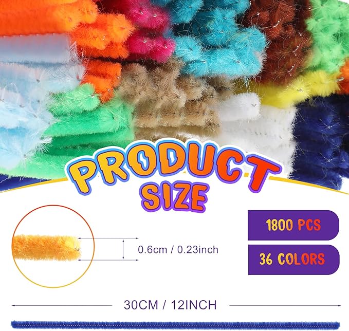 1800 Pcs Pipe Cleaners 6 mm by 12 Inch Chenille Stems Pipe Cleaners Craft Supplies Art Supplies for Kids Adults DIY Creative Decorations, 36 Assorted Colors