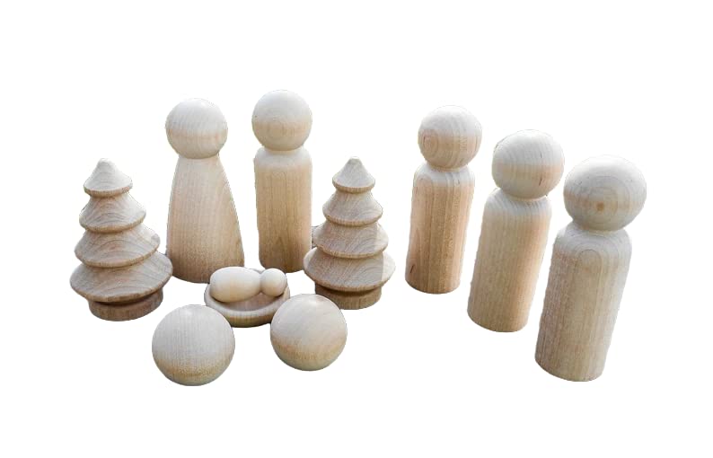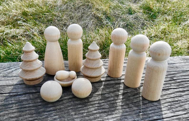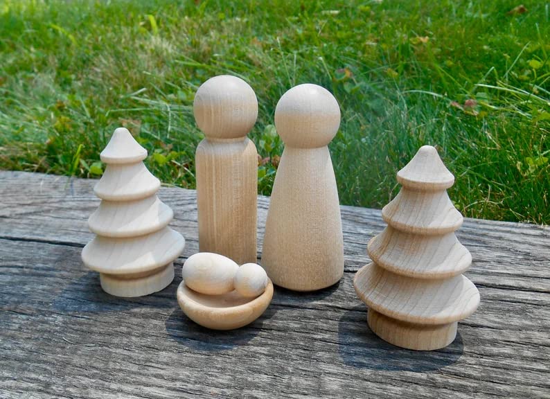 Nativity Wood Dolls, Baby Jesus and Manger, Mary, Joseph, 2 Blank Sheep, 3 Wisemen, 2 Miniature Trees, DIY Peg Dolls, Unfinished Pegs